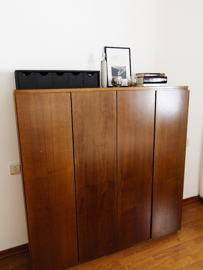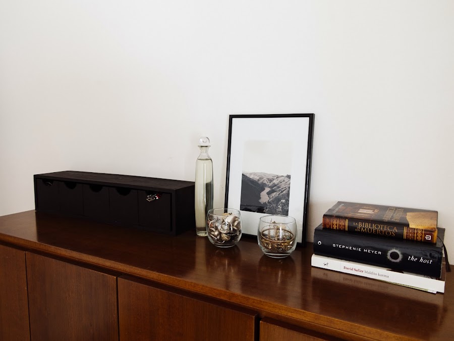 En los pies de la cama y entre el armario y la puerta, colocamos el mueble que había en el comedor, cosa que nos vino perfecta como zapatero, ocupado mayormente por mi, jeje. Y como decoración, una cajonera que ya tenía, que pinte de negro, donde guardo mis accesorios, un cuadro en blanco y negro y unos libros a forma de decoración, en los mismos tonos para no romper el juego monocromático.