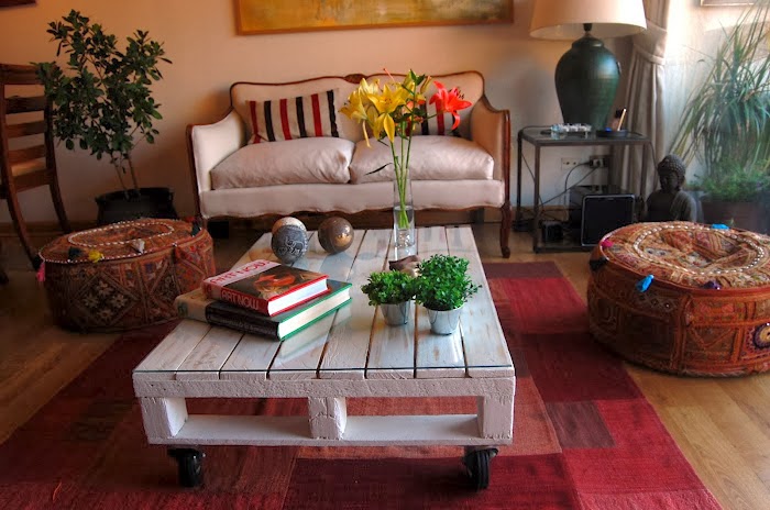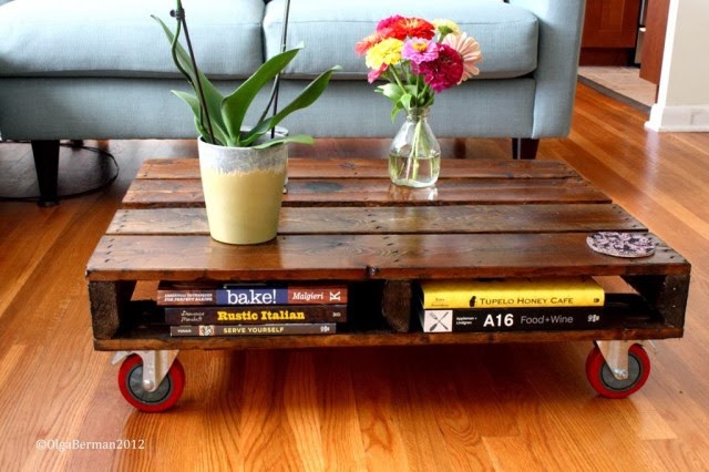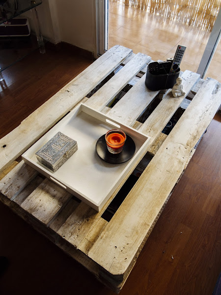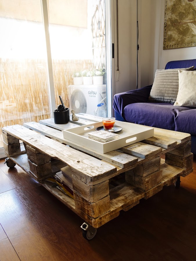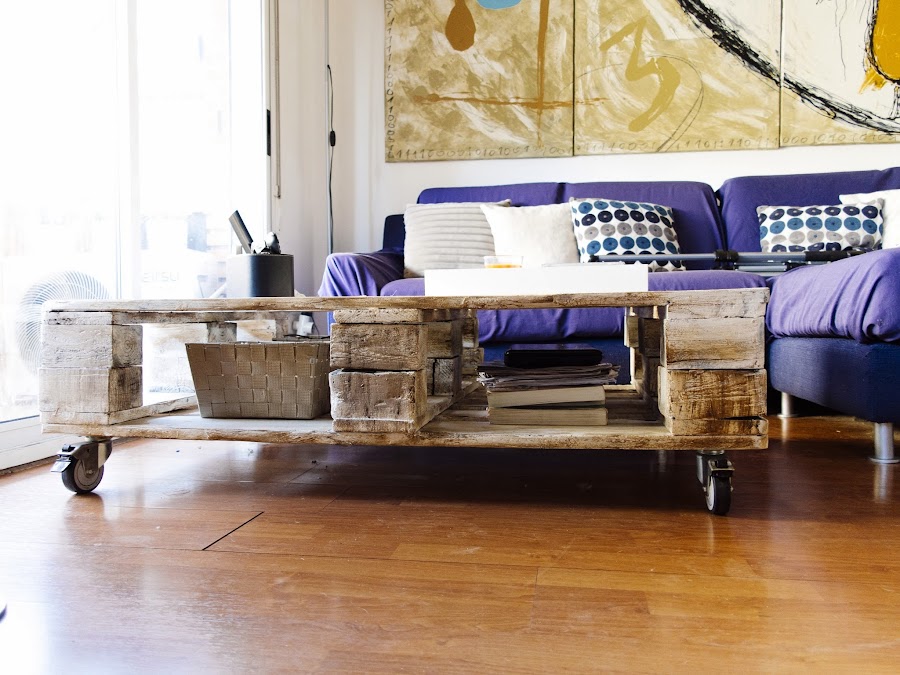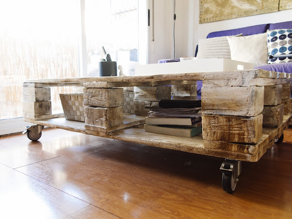 Hoy os quiero enseñar mi mueble estrella de la casa, mi mesa de café. Tras mucho indagar descubrí esta forma económica de tener una mesa de café que se adaptase a mi estilo, ya que la que venia con la casa era una pequeña de cristal cuadrada muy simple, en fin, solo tendréis como presupuesto los palets, que en cualquier sitio que trabajen con ellos os los pueden dar, la pintura y las ruedas, dos normales y dos con frenos, eso si la ruedas buscarlas en un sitio barato y no os valláis a LeRoy Merlín como yo que no sabia que dentro del bricolaje es la tienda mas cara. Pero para que os hagáis una idea el presupuesto son unos 30 euros. No tengo fotos de como la hice, porque cuando la hice no sabia que quería abrir este blog, por eso os lo pongo este enlace a un video en youtube que esta bastante bien (http://www.youtube.com/watch?v=3rlyTUKgmp0) y os resumo un poco lo que yo hice.
