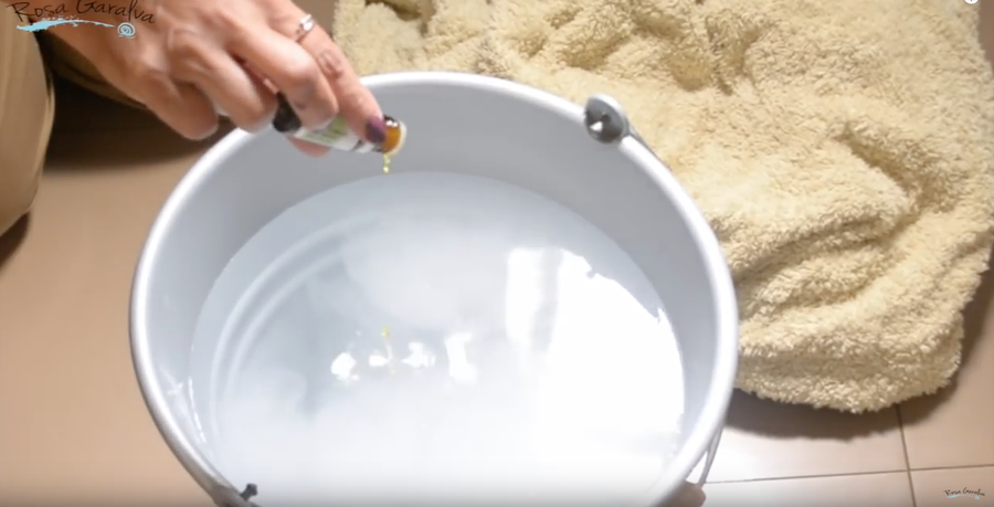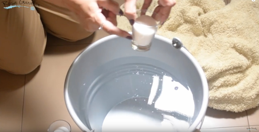 En una cubeta pon agua y agrega 1/2 taza de vinagre, 50 gr de sal de mesa, 30 gr de bicarbonato de sodio y unas gotas de tu esencia favorita, esto último es opcional incluso puedes exprimir un chorro de limón que le aportará un aroma muy agradable.