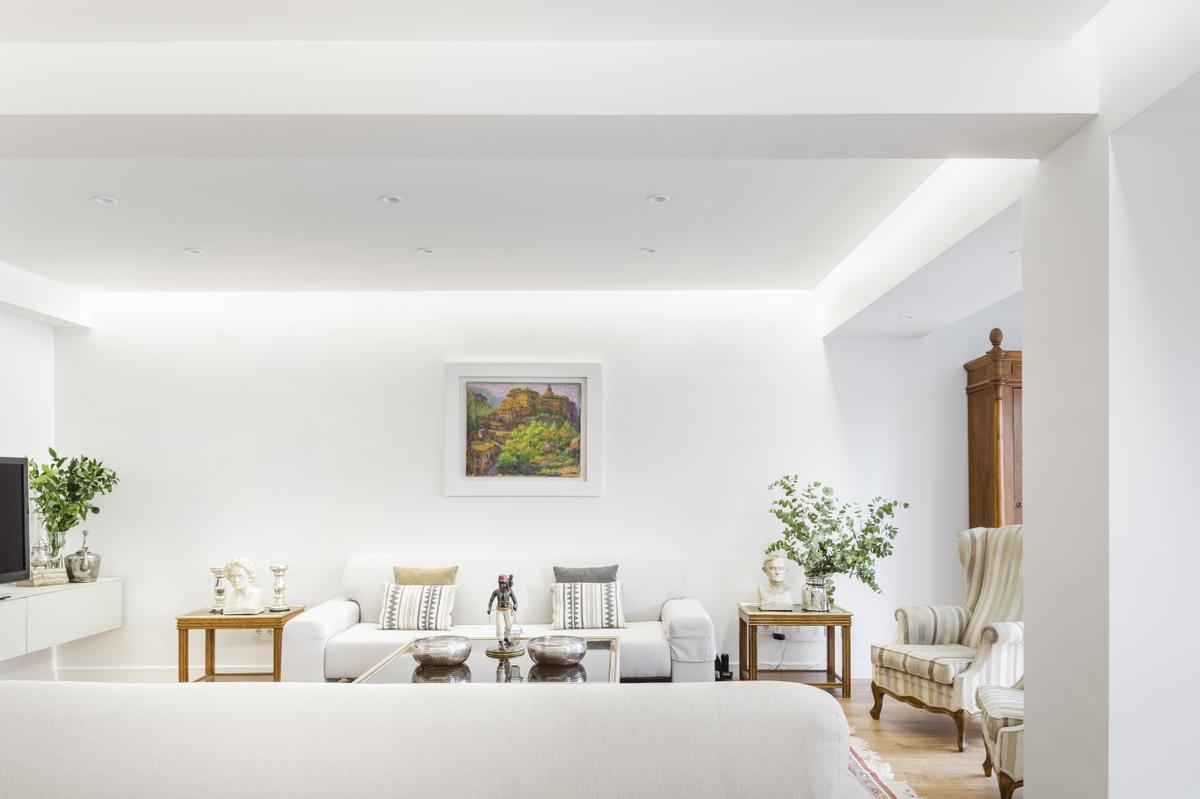 Se actuó sobre el pavimento, unificándolo en toda la vivienda; así como en techos y puertas. Ahora y a través de ciertos signos de modernidad, se acudió al vidrio como elemento separador y a las fosas que ocultaban los leds, acompañadas de focos de pequeña dimensión.