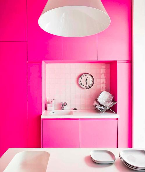 Vía...Os daréis cuenta como, un color normalmente tachado de cursi, encaja muy bien incluso en ambientes modernos, y cómo, según el tono e intensidad del rosa utilizado, es capaz de cambiar el estilo de la cocina, independientemente de los muebles utilizados.