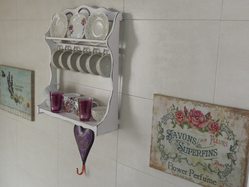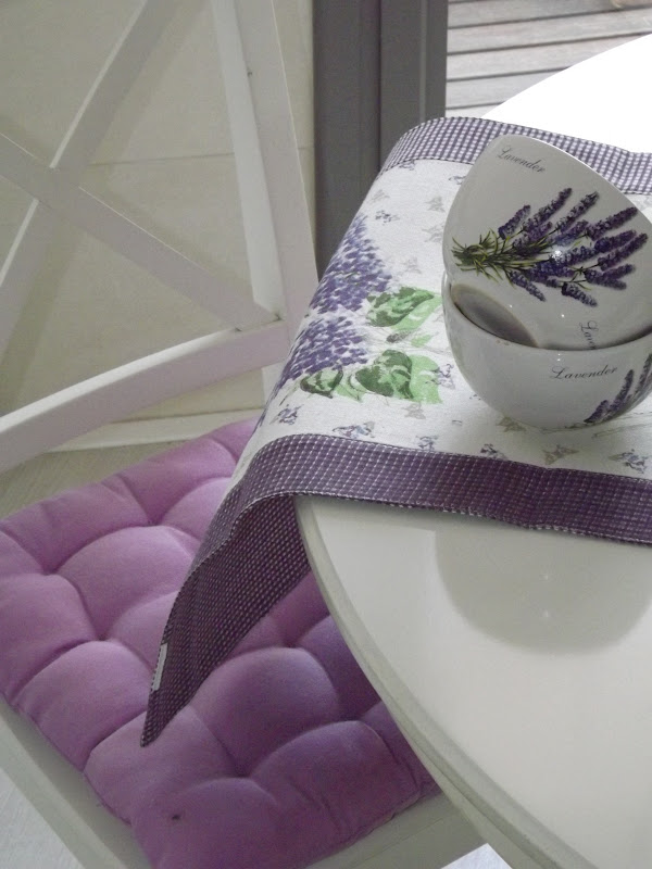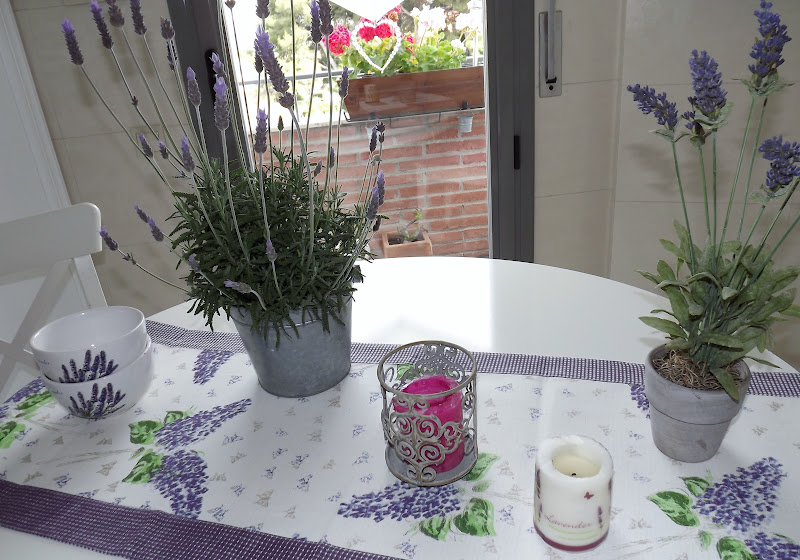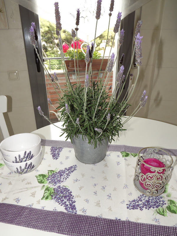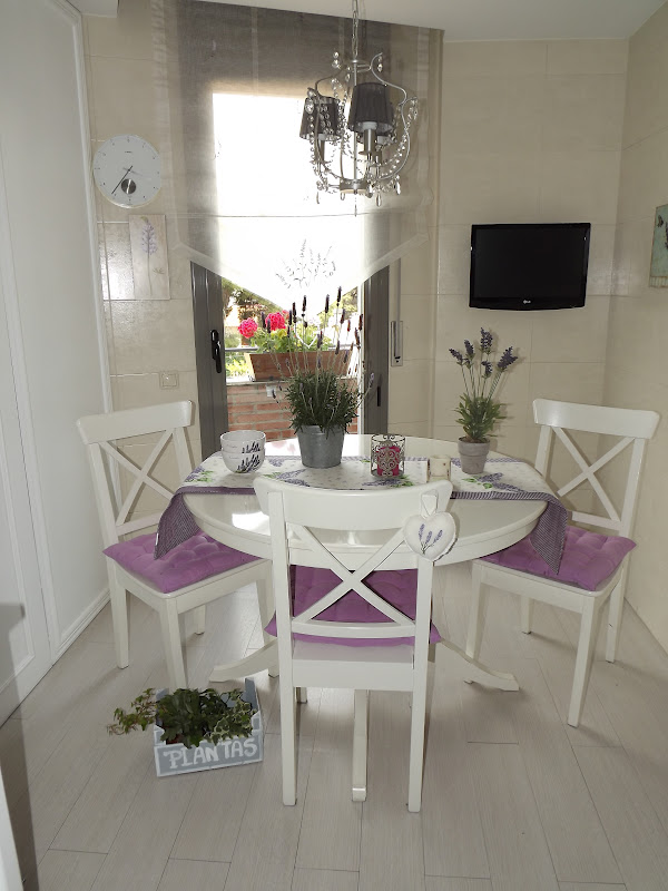 Basta con colocar cojines y complementos en tonos malvas y rosados,un camino de mesa con motivos estampados ,plantitas de lavanda por doquier,piezas de loza antiguas y como base mis muebles lacados en blanco...El conjunto es delicado y vivo a la vez,recrea sin lugar a dudas las cocinas de la Provence y cuando me siento a tomarme mi café, imagino estar en uno de esos pueblos del sur de Francia en el que un día me gustaría perderme...