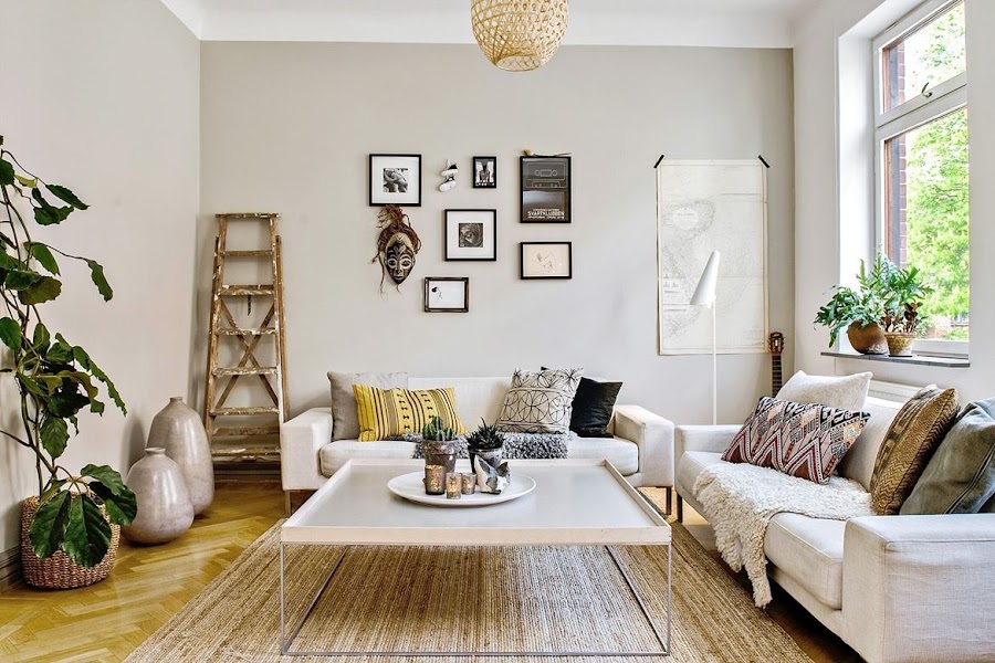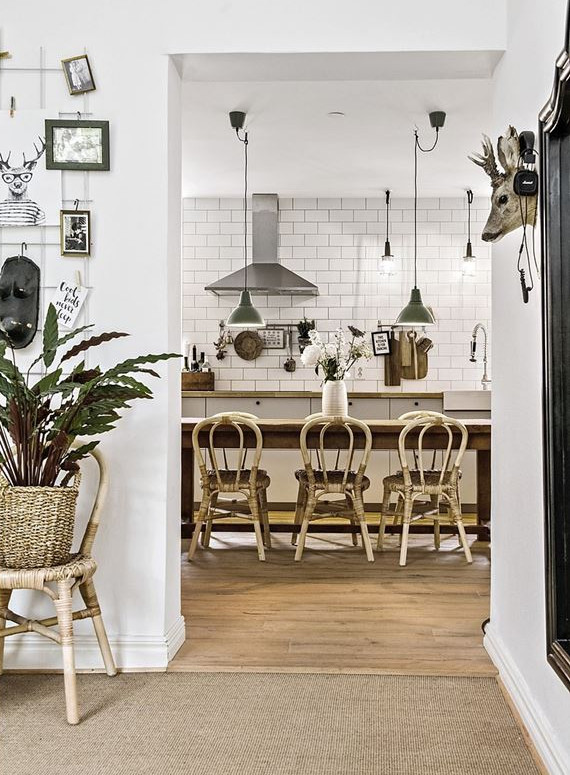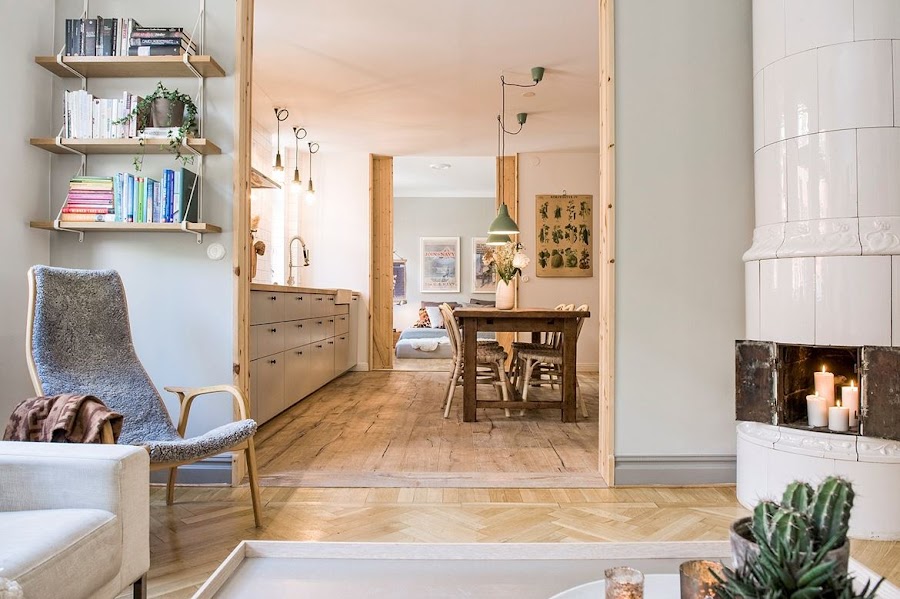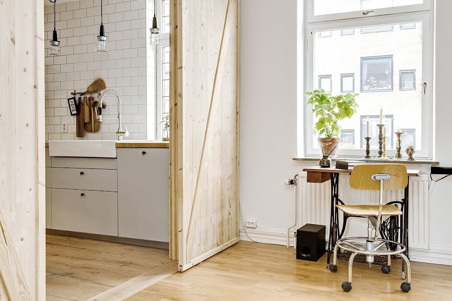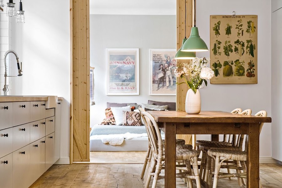 Pero bueno, volviendo al tema de hoy que es este precioso apartamento podemos ver en su decoración esos toques rústicos y vintages que os hablaba al principio, aunque sin renunciar al estilo nórdico que es usado como base(muebles de cocina, complementos, salón, muebles de los dormitorios...). Estos toques podemos verlos repartidos por todo el apartamento en forma de objeto decorativos o mobiliario aunque es especialmente en la cocina donde mas acentuados están. Y es esta última sin duda mi espacio preferido de este apartamento. Justo por esa mezcla tan acentuada de elementos rústicos junto con otros más modernos y por la sensación tan acogedora que transmite.