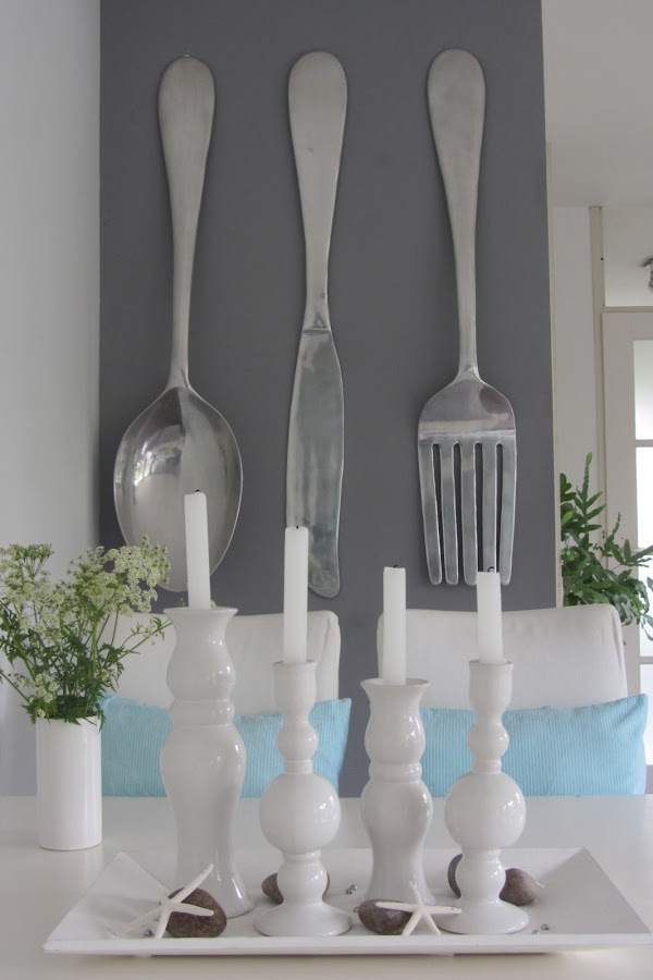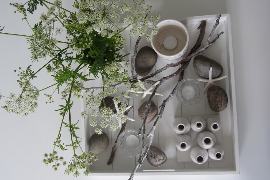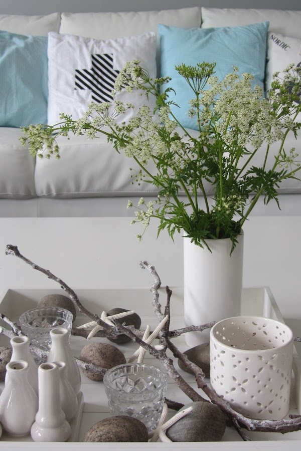 Para recibir la nueva estación he colocado uno que otro detalle en diferentes rincones de casa, en el comedor, un arreglo de mesa muy sencillo y facil, piedras, estrellitas de mar, flores silvestres y unos cojines aguamarina.