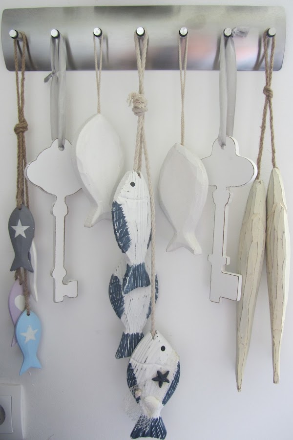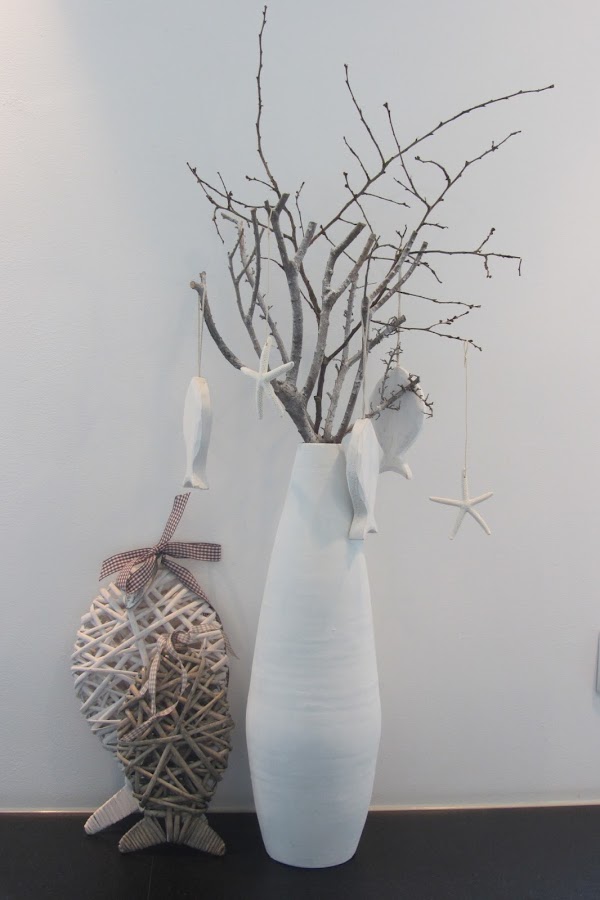 En la cocina mi jarrón con ramas secas de las que cuelgan peces y algunas estrellas de mar, tambien dos peces de mimbre recostado a la pared.