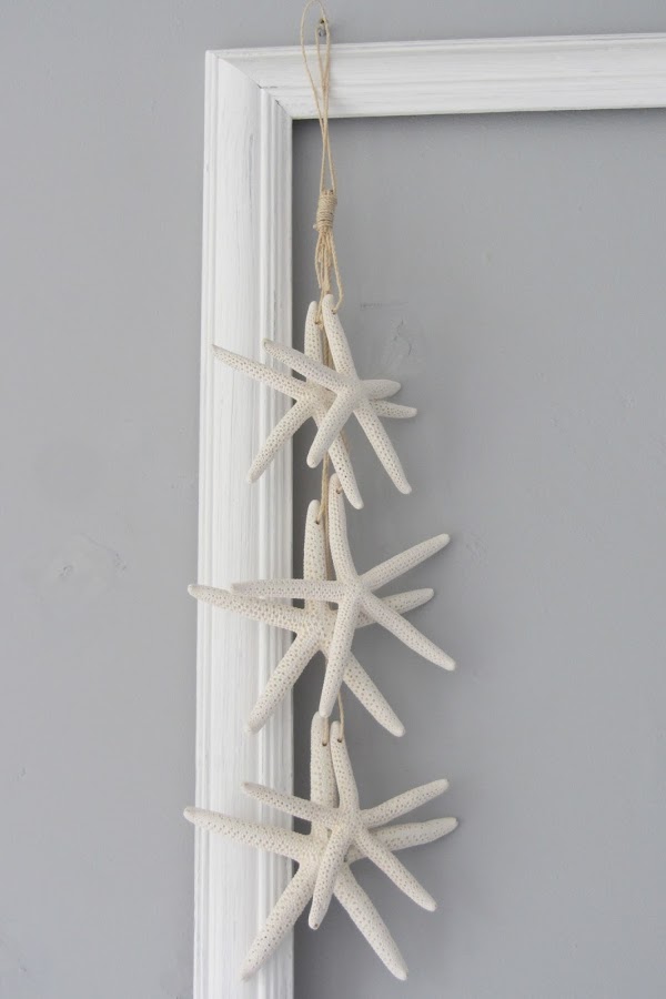 En uno de los marcos que reposan sobre la balda colge este gajo de estrellas marinas, como me encantan!