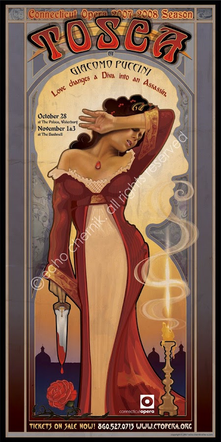 Roma, 1800. El republicano Angelotti huye de la prisión del Castel Sant"Angelo y se refugia en un iglesia donde su amigo, Mario Cavaradosi, decora sus muros pintando frescos con la imagen de María Magdalena. Scarpia, jefe de la policía borbónica, encarcela a Mario, torturándole para saber el paradero del prófugo. Tosca, famosa cantante y celosa amante del pintor, intercede por éste. Para ello, ofrece su cuerpo a la lujuria de Scarpia a cambio de fingir el fusilamiento de su amado. Pero Tosca aprovecha, y en el momento en que el jefe de policía firma un salvoconducto para ella y Mario, mata a Scarpia salvando su honor. A continuación, se dirige al castillo, donde pone en antecedentes de la farsa a Mario para que haga bien su papel de fusilado. Pero las armas del pelotón no están cargadas con salvas, no... El pintor es realmente ajusticiado y Tosca, ante tal horror, pone fin a su vida lanzándose al vacío.