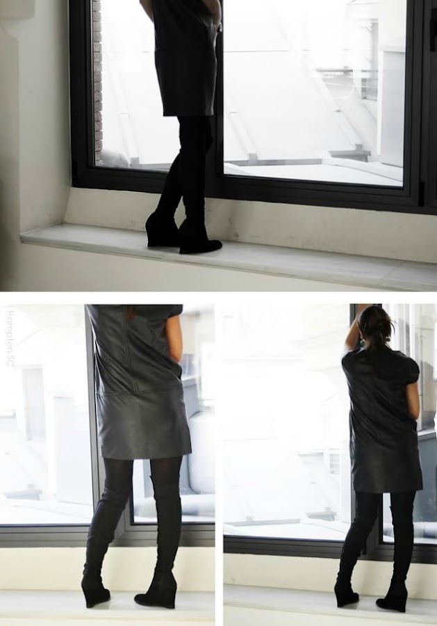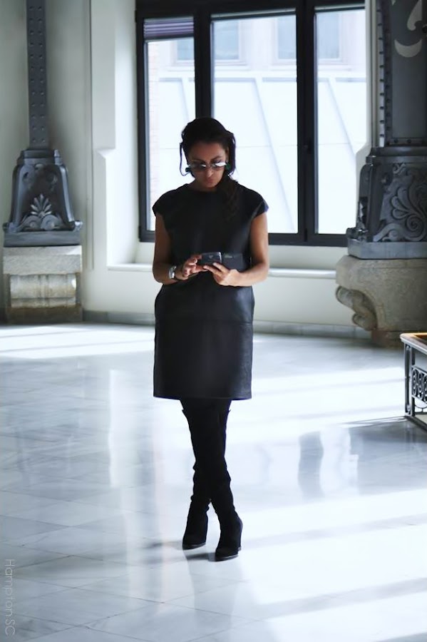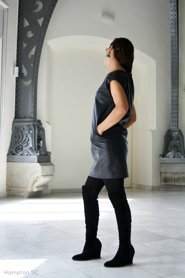 Vestido de piel negra de Mango con un original corte y botas altas con