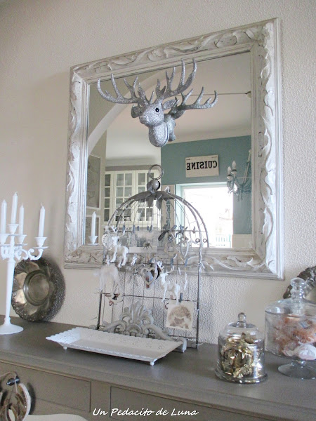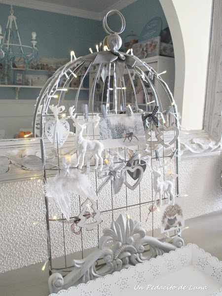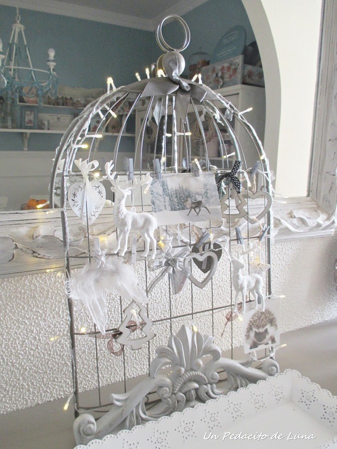 En la mesa-cómoda que da al comedor y la cocina decoré con luces y algunos complementos navideños la jaula metálica bajo la atenta mirada de.....