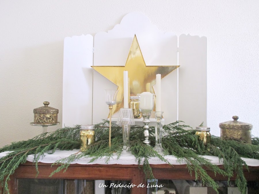 Encima de la librería, cual si se tratase de una chimenea, una estrella guía y punto focal, despliega sus reflejos dorados rodeada de velas y pino silvestre fresco