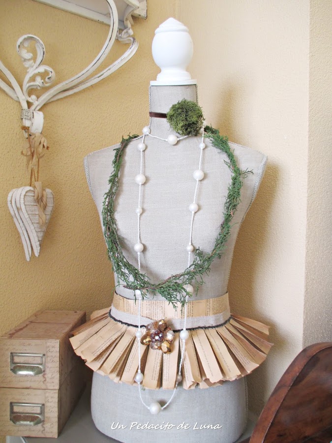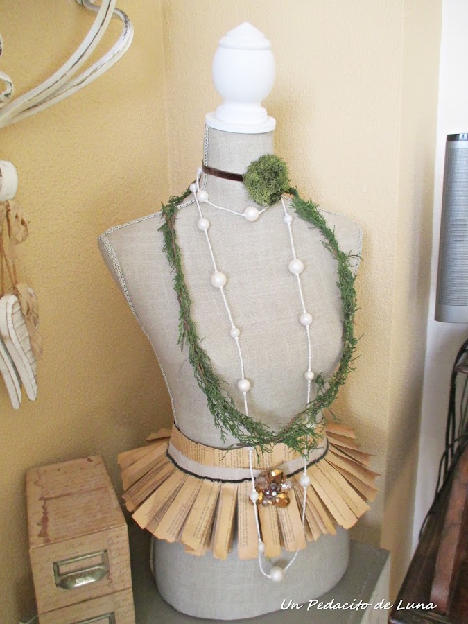 Apenas dos farditos de pino dieron para bastante, tanto es así que hice un collar al maniquí y lo coroné con una gargantilla de musgo natural con lazada de terciopelo marrón.