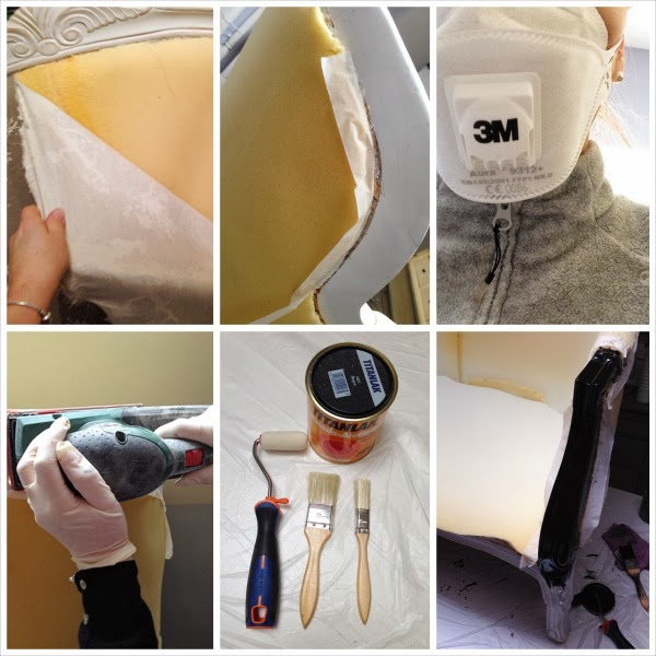 Quité la tapicería anterior, retiré todas las grapas sueltas, me puse la máscara y a lijar, lijar, lijar ......y luego a pintar.