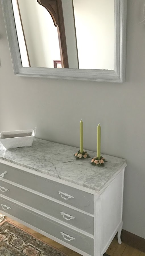 Conservamos la encimera de mármol que tenía la cómoda porque le da prestancia al mueble y ademas los colores nos pegaban perfectamente.