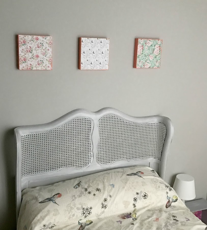 El cabecero es una pieza única, y además estos cabeceros están muy buscados por los amantes de la restauración. Hicimos también unos cuadros utilizando pintura chalk en color coral y unos papeles de flores de scrapbook. Un gran armario de Ikea igual que en la otra habitación y unos pomos con un toque de color.