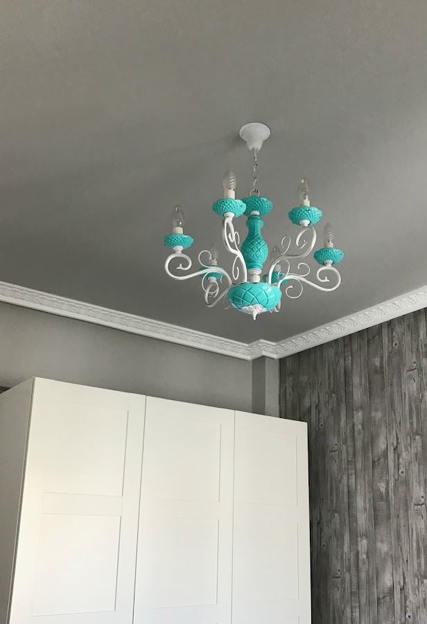 Una lámpara comprada en Wallapop (un sitio estupendo para encontrar tesoros), con cuerpo en dorado y detalles de cristal, nos sirve para esta habitación de techos altos. Pero primero la sometemos a una transformación.