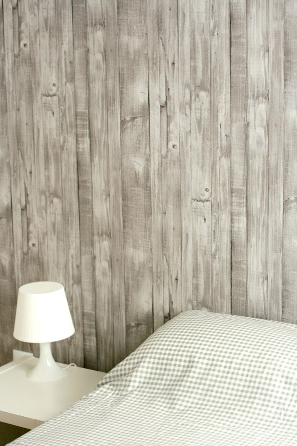 En la habitación principal, se empapeló la pared del cabecero de la cama con un papel imitando lamas de madera grises. El color de las paredes en un gris más claro. Un armario de gran capacidad de Ikea y una cama de 1,50.