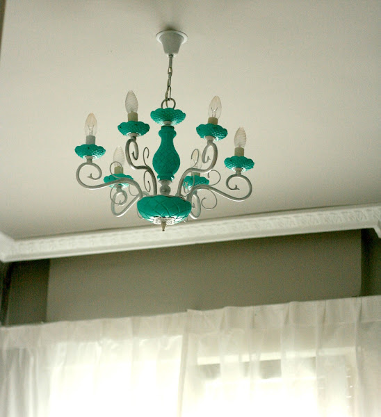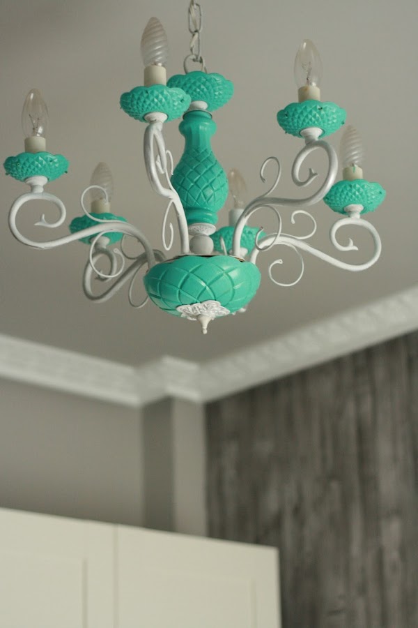 La base la pintamos de blanco y las piezas de cristal en un color aguamarina que me parece precioso y muy original. Acabamos un barniz satinado.