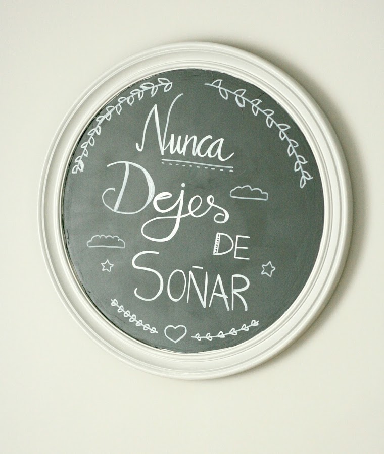 Otro detalle de la habitación principal, fue recuperar un espejo redondo que habia en la casa, el cual pintamos el marco de gris y el espejo con pintura negra de pizarra. Escribimos una frase motivadora totalmente idónea para una habitación con rotuladores de tiza blanco.