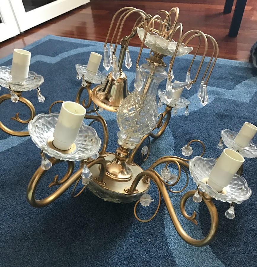 La desmontamos y limpiamos (consejo: sacar fotos del orden de colocación de las piezas, no será la primera vez que no nos acordamos de cómo iba). Le quitamos los cristalinos colgantes y esas barras superiores, para darle un aire mas actual. Limpiamos bien y cambiamos el cableado.