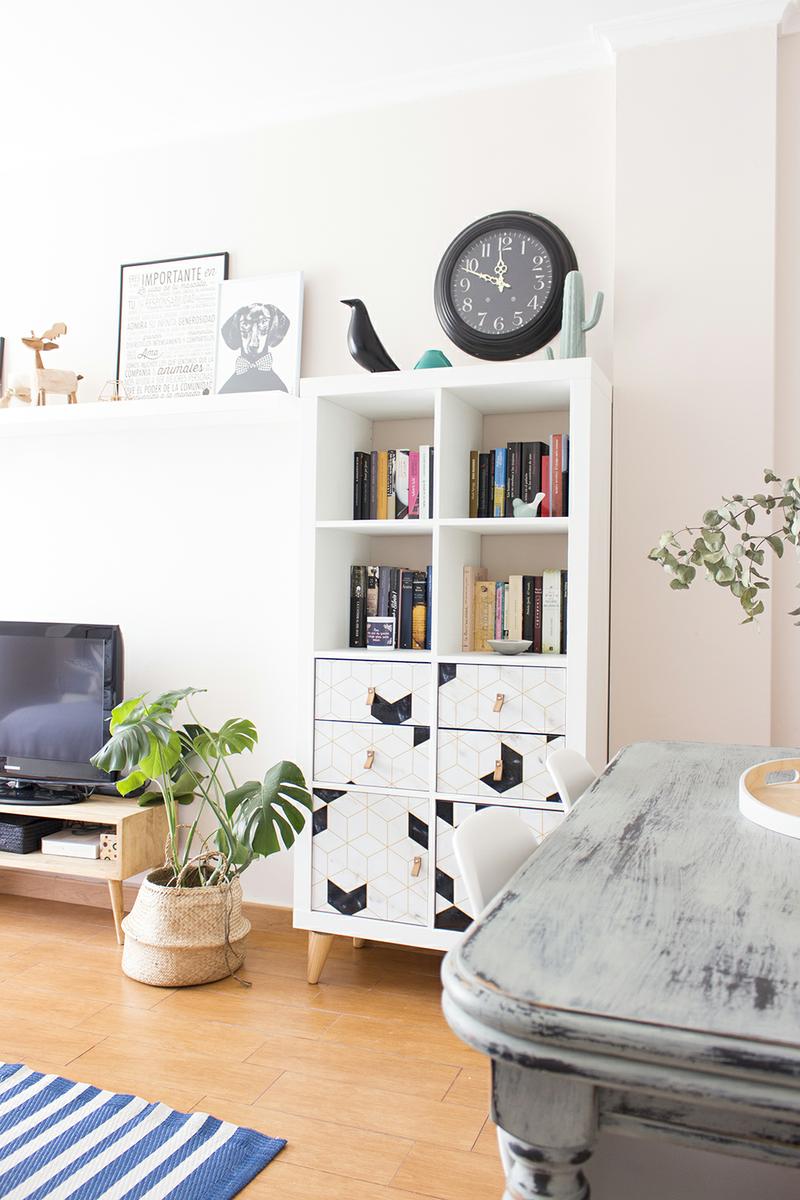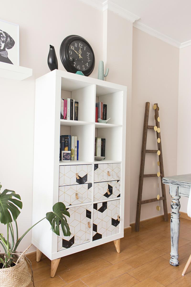Si algo intento transmitir con mi blog es que se puede conseguir una casa bonita con decoración low cost. Que tener muebles y piezas únicos a precios asequibles se puede conseguir con un poco de imaginación. Una muestra de ello es la estantería kallax que reina en mi comedor. En los casi 8 años que lleva aquí ha sufrido tantas transformaciones que ya no recuerdo como era la original. La última gran restauración fue ponerle unas patas cónicas de madera y pintar las puertas de los armarios y cajones en gris envejecido. Quedé muy contenta con el resultado, sin embargo me seguía pareciendo demasiado normal, así que he ido más allá y la he transformado en un moderno mueble geométrico.