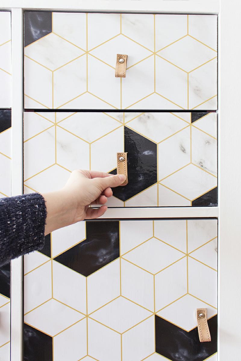 Simplemente poniendo vinilo a los frontales de los armarios y cajones ya he conseguido que mi estantería parezca otra.