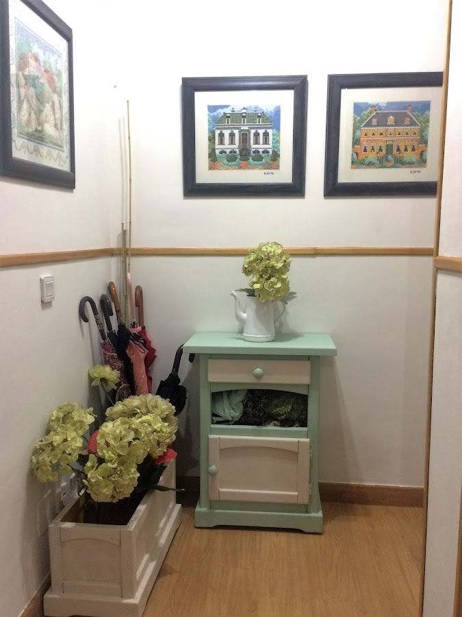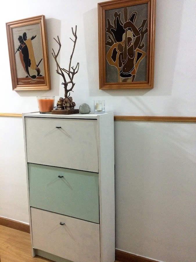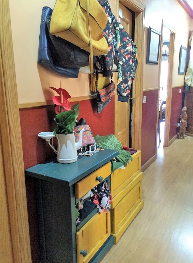 Luego además he añadido un mueble zapatero que tenia en otro lugar de la casa y era oscuro, lo he pintado en los mismos tonos que el resto y he colocado en el pasillo.