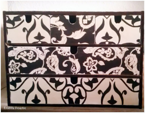 Yo la tengo desde hace varios años y la transformé como podéis ver, imprimiendo unas imágenes en blanco y negro recortándolas a la medida y luego pegándolas con cola, para terminar pinté los bordes en negro con un rotulador indeleble y protegí el papel con varias capas de cola, es decir, técnica decoupage.