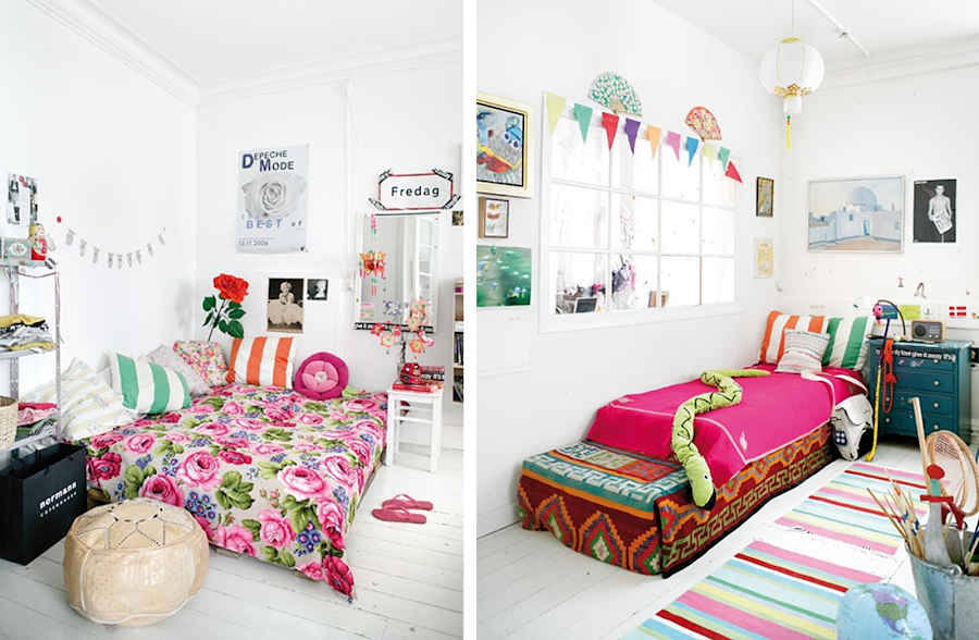 Los dormitorios de los niños están llenos de color con alegres colchas y recuerdos de viajes. En cuanto al mobiliario, los colchones apoyan sobre palets, además tanto las mesillas como estanterías son por supuesto recicladas.