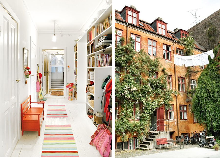 En el largo pasillo se instalaron una fila de estanterías para guardar libros y que además sirve de gabanero.