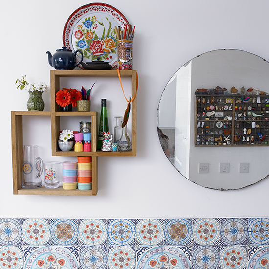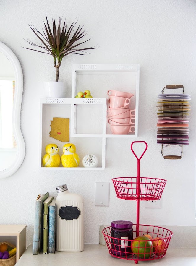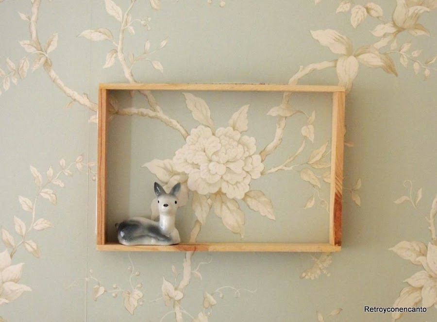 Un marco, un cajón o una caja desfondada (como ha sido nuestro caso)..., pueden transformarse, en un momento, en ligeras estanterías que cambien por completo el aspecto de una pared. ¿No os parece una propuesta decorativa sencilla y encantadora?