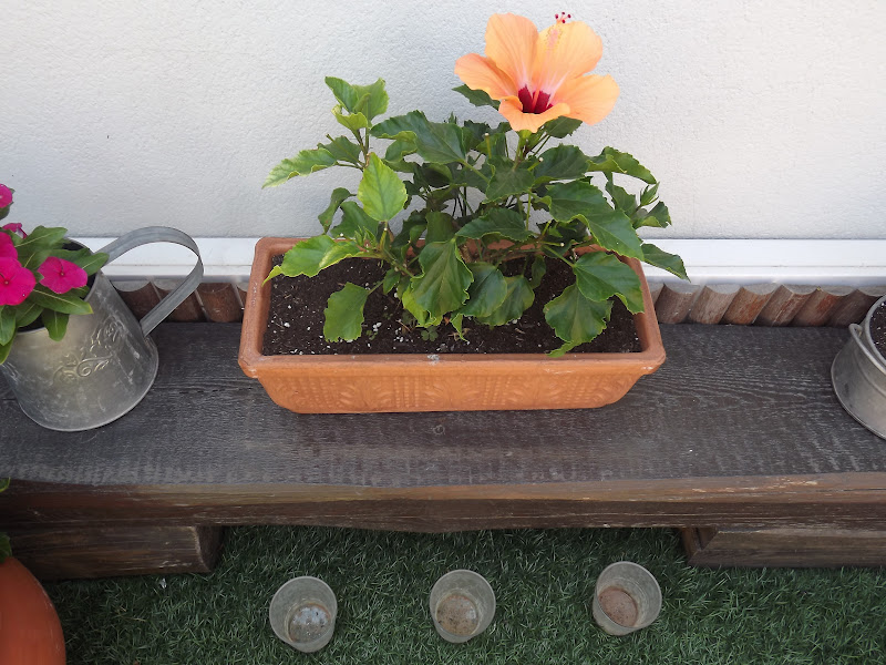 Para los hibiscus eligo jardineras de barro y para el helecho un gran cubo de zinc...y ¡ya está!... luciendo en mi terraza.Que maravilla cuando se abran todos los capullos naranjas y rojos será una explosión de color.Me encantan los hibiscus aunque sus flores duran apenas un día,no importa brotan tantas a la vez que apenas ni se nota,los coloco un poquito a la sombra para que sus verdes hojas no se quemen y me quedo mirando lo bonitos que son.