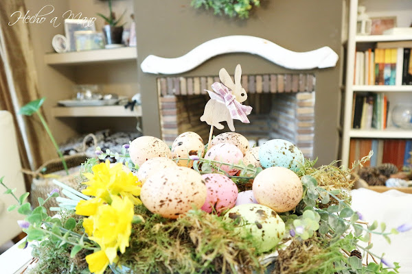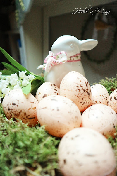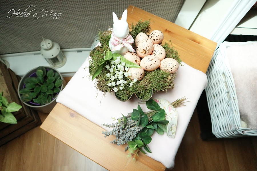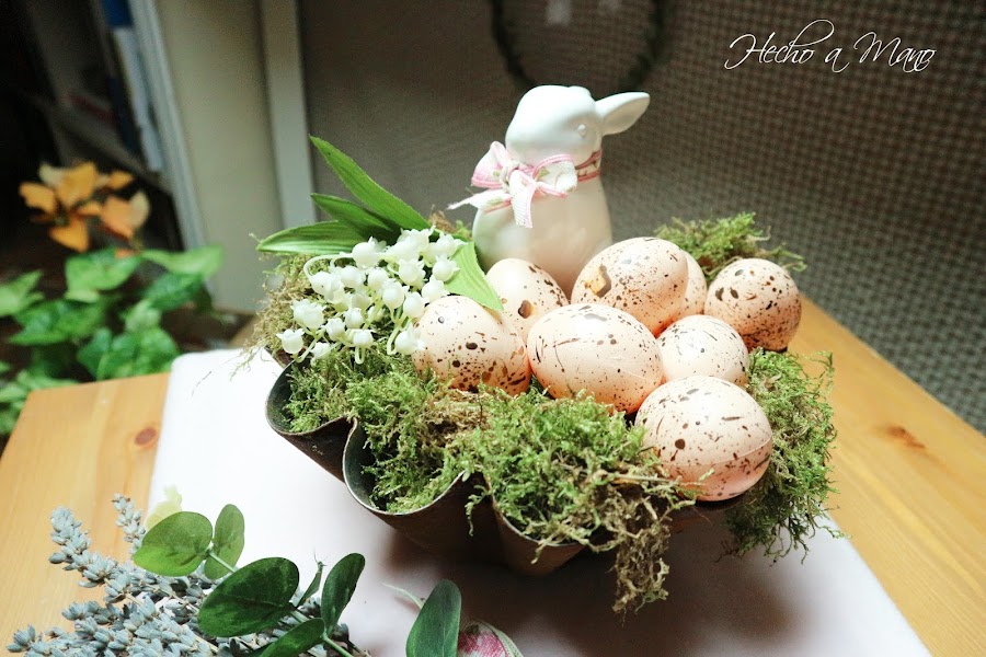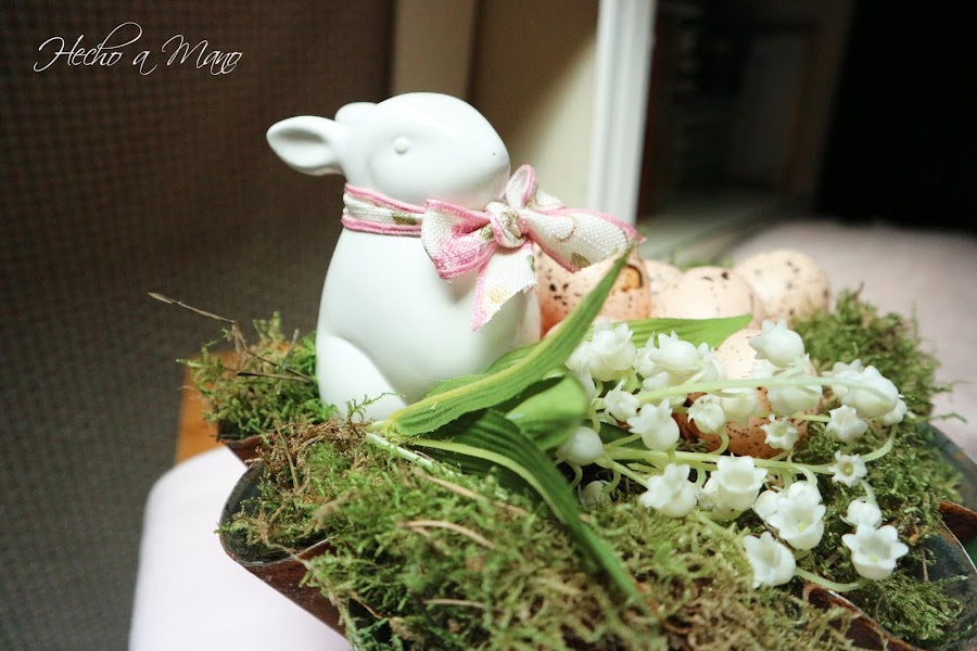 Sobre dicha flanera, musgo natural, huevos, flor de muguete, en éste caso artificial y un conejillo blanco con un lazo en tonos rosas.
