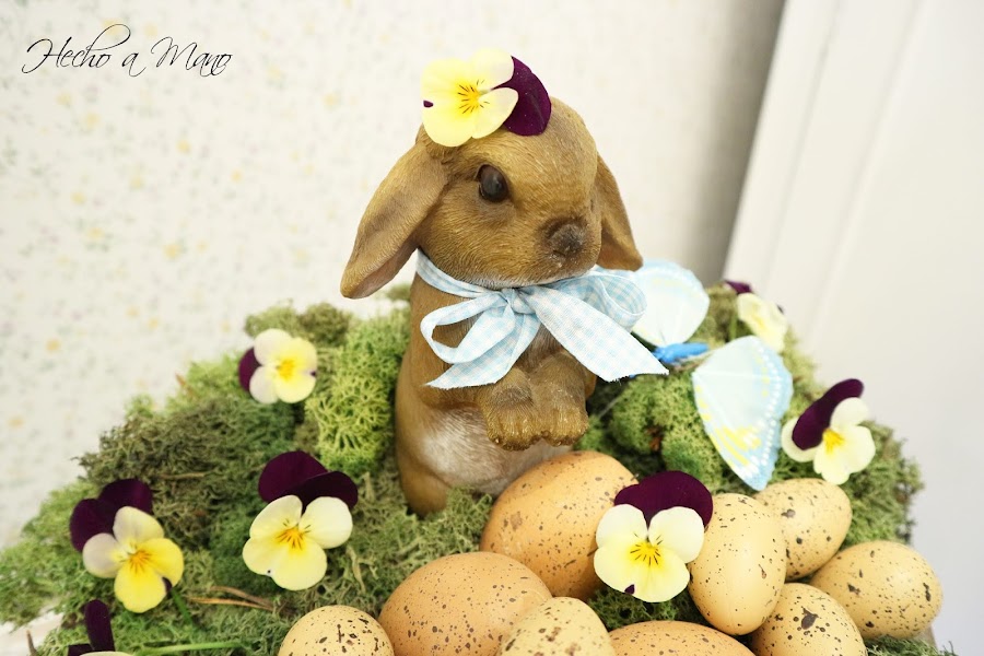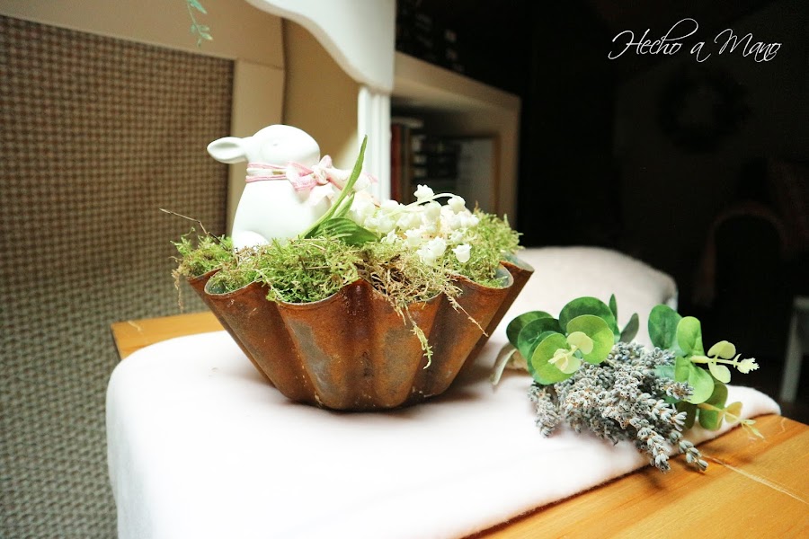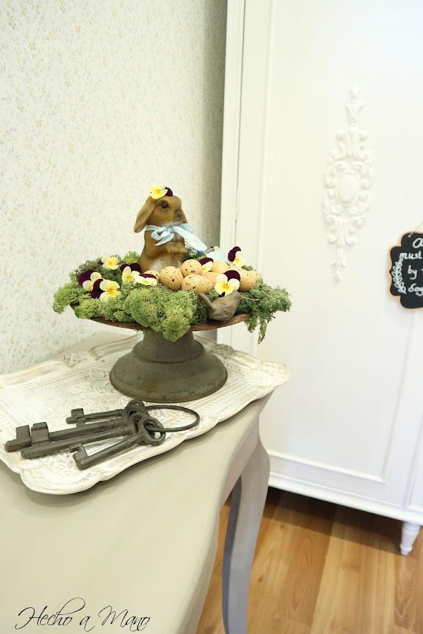 Un viejísimo y oxidado bebedero de pájaros que has visto en diferentes ocasiones hace de contenedor. Sobre él, liquen, flor de pensamiento natural, los huevos y un conejito al que he acicalado con un lazo en cuadros vichy y una linda flor sobre su pequeña cabeza. Así, tan fácil. La entrada de casa ha quedado vestida de Pascua.