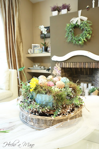 En el salón un molde de bizcocho muy chulo, que compré en Lidl hace unos meses, hace de soporte para el musgo, los huevos de colores y la flor de narciso natural. Un pequeño conejo de madera con una lazada asoma por encima de éste arreglo y todo ello está en una bandeja de ratán rodeada de una de mis coronas
