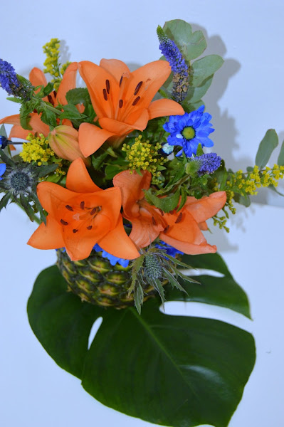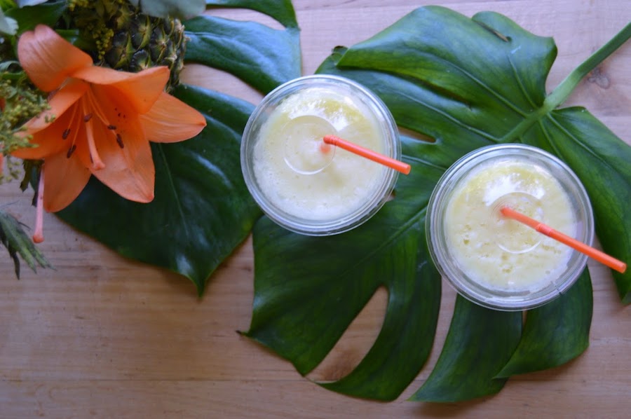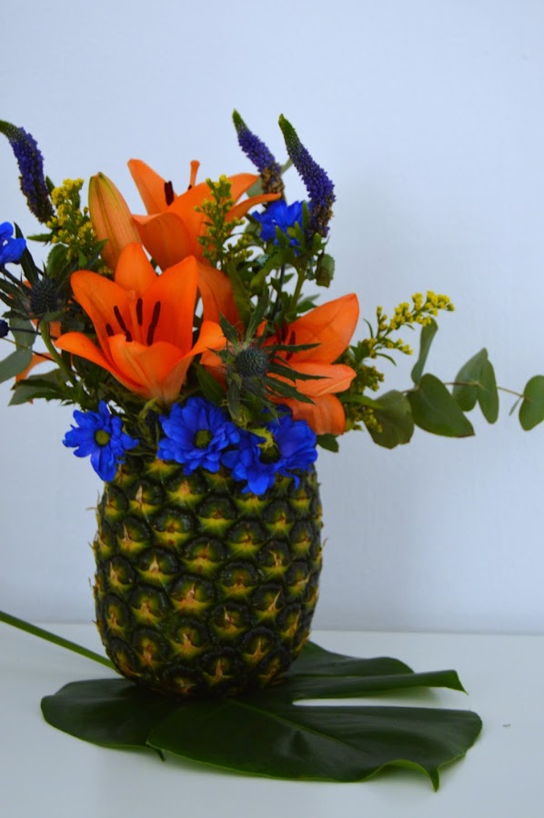 El principal elemento elegido por Mi Silla Azul es una piña, como en esta casa se aprovecha todo, hemos utilizado la carcasa para hacer un centro floral y la pulpa para preparar unos smoothies de piña riquísimo y así estrenar la licuadora que nos regalaron por Navidades, que es muy bonita y muy decora muchísimo pero que no había utilizado hasta hoy.