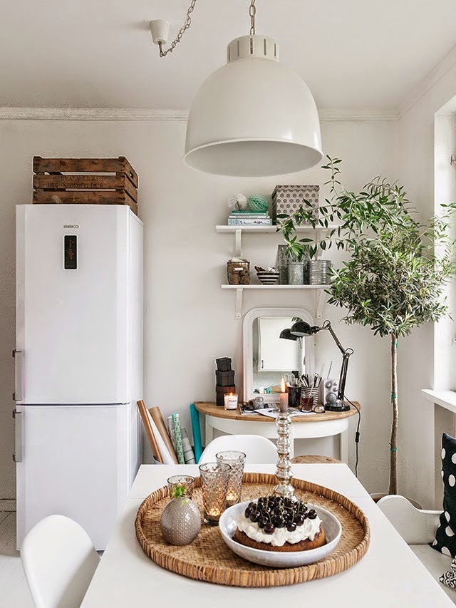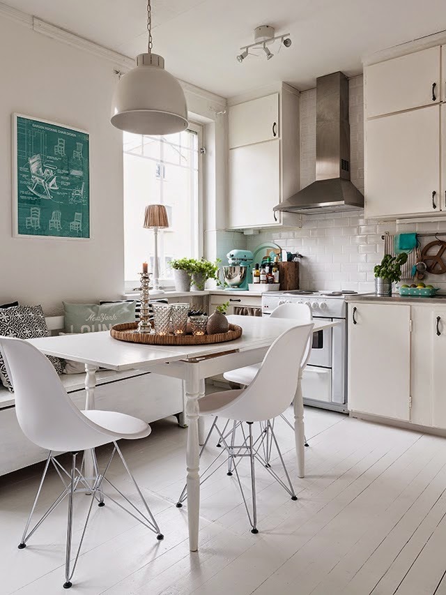 En el otro caso pasa algo parecido, cocina de tonos claros que puede resultar algo aburrida. Pues aquí se han introducido elementos de madera que ya hemos visto en cantidad de ocasiones lo bien que quedan con el blanco y han apostado por el color turquesa. Unas cajas con color, un cuadro, algún textil y algo de menaje, salpican la cocina de contrastes y alegría.