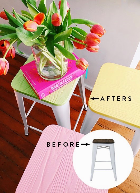Hoy os dejo aquí dos casos. Uno en el que simplemente han pintado la parte superior de unos taburetes que en principio eran de madera oscura y aburrida. Simplemente con ese toquecito de color y haciendo juego con esos tonos, han incluido algo de vajilla y menaje consiguiendo que realmente parezca otra. No necesita mucha inversión y la cocina ha tomado una imagen mucho más alegre.