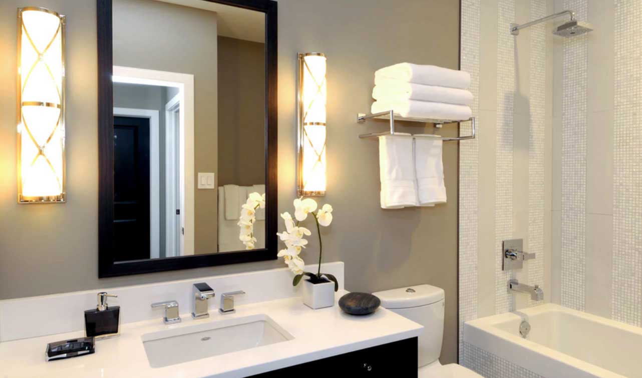 Es preferible que la luz venga desde tres puntos distintos, uno de los cuales debe estar situado sobre el espejo (o tocador) y puede ser una lámpara de techo, y los otros dos en la pared, uno a cada lado del espejo.Su iluminación debe ser práctica y funcional. Si el baño es amplio, o la bañera está en un área o nivel aparte, será importante iluminarla de forma independiente. La luz de la bañera no necesariamente tiene que ser clara.