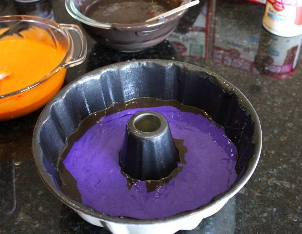 A la hora de colocarlo en el molde lo haremos poco a poco para que nos quede el efecto deseado y no se mezclen los colores. Una vez más seguiremos las instrucciones del fabricante para hornearlo. Una vez frío cubrimos con el frosting que hayamos comprado.