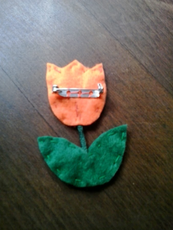 Una vez cosido el cordón y antes de unir la parte delantera y trasera de nuestros pétalos, no olvidéis coser el broche en la parte posterior a donde hemos unido el cordón, para después poder colgarnos nuestro broche.