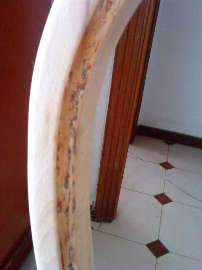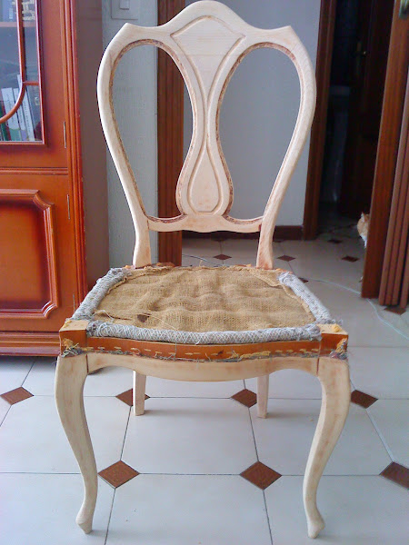 Después de quitar millones de grapas, comenzamos con el decapande para quitar ese color caoba tan típico de los 70. Y tras el decapante y una pasada con con una lija de grano fino, la silla tenía este aspecto...