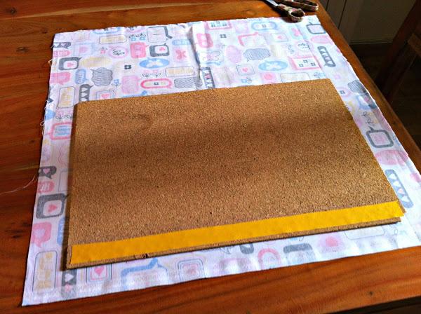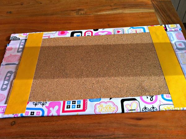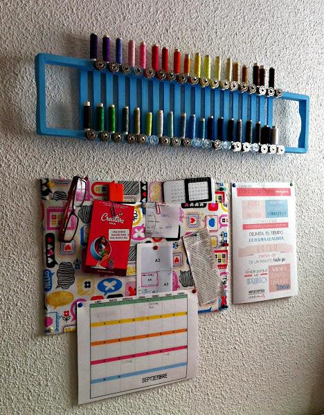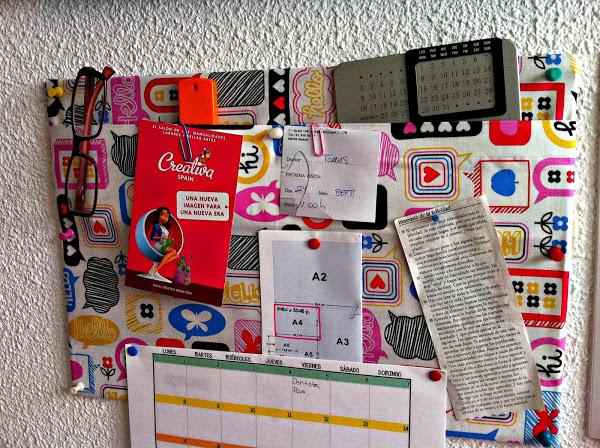 Hace unos días os enseñe el organizador de hilos que colgué encima del escritorio, pero no estaba 100% convencida sobre si pegaba ahora el triste corcho, así que decidí entelarlo para darle un poco de color. Estos son los materiales que vamos a utilizar: corcho, tela, cinta de doble cara y tijeras.