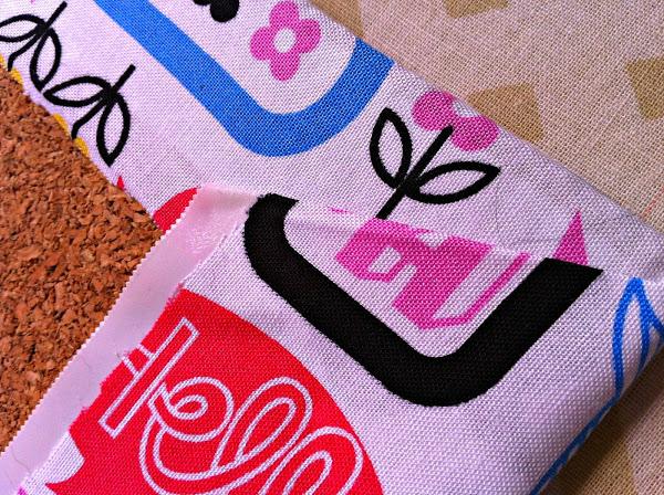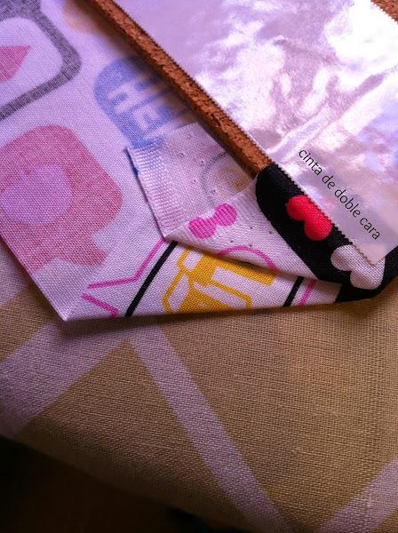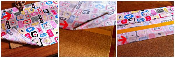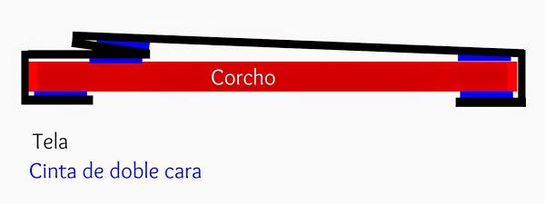 Luego hacer la doblez para hacernos una idea de donde va a ir, pegar una cinta entre el corcho y la tela y otra justo en la doblez (la flecha indica donde está la cinta entre el corcho y la tela).