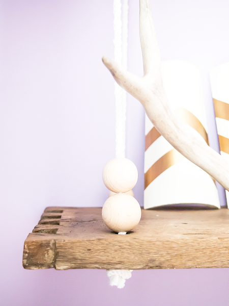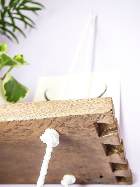 El sistema para crear este tipo de estante no puede ser más sencillo. Los orificios para pasar las cuerdas -estas han de ser resistentes-, una escarpia a la pared y nudos en los extremos, nudos que tendréis que ir rectificando hasta que veáis la balda a nivel, claro que en este paso os vais a volver un poco locos pero el resultado merece la pena.