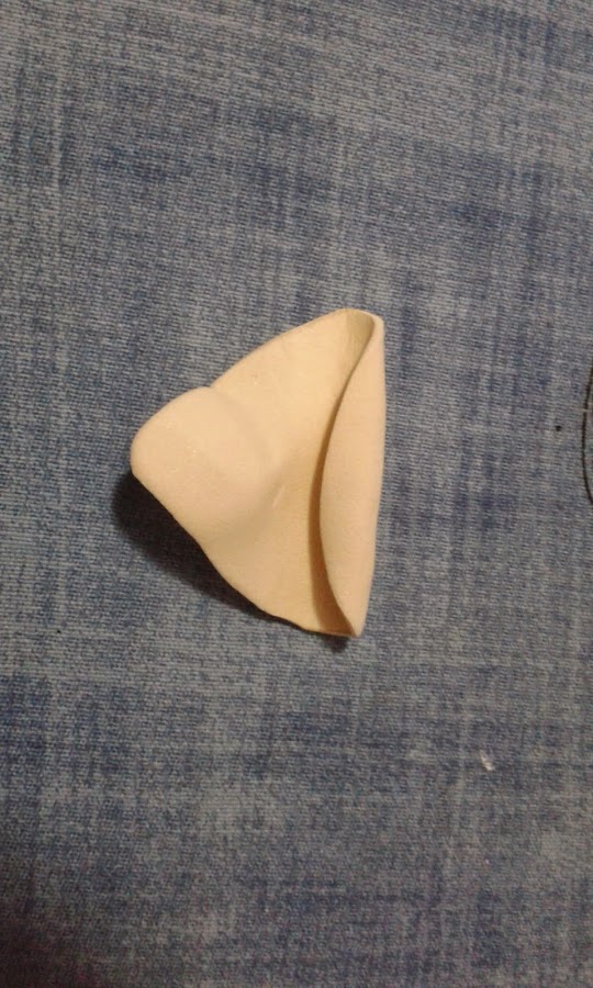4 Aplicamos calor con la plancha en los extremos de los pétalos y doblar la goma eva con los mismos dedos, dando la forma, también dar calor en el centro del pétalo y con el dedo pulgar dar forma sera por donde iremos pegando al centro de la flor.