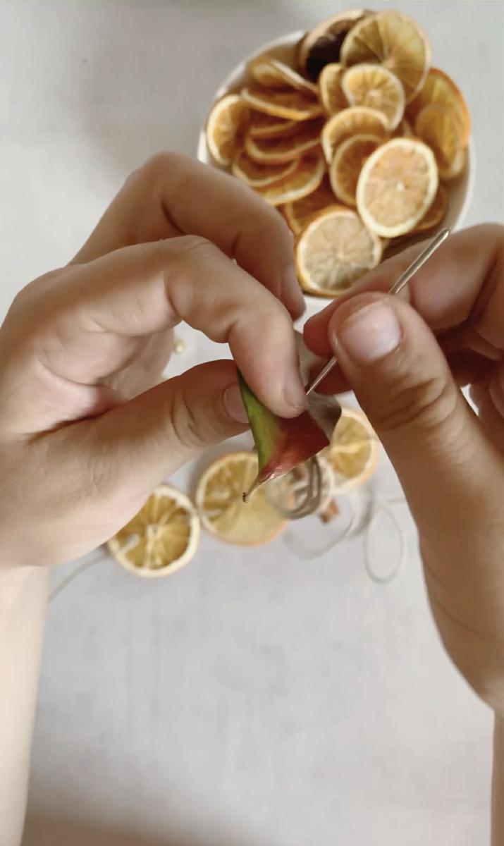 Si decidimos hacer esta guirnalda más en navidad que otoño, yo os recomendaría añadir un poco de eucaliptos o alguna cinta roja para darle el toque navideño. Si además, vuestros hijos os van a acompañar en el proceso no hay problema. Podéis usar las agujas que os muestro aquí. Y si queréis hacer el tutorial completo y hacer los cítricos vosotras mismas, podéis ver cómo en el tutorial que os hice el año pasado aquí. Si no, podéis comprarlas ya hechas en Gardens o en este enlace.