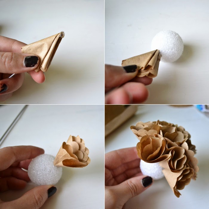 Doblar el papel como en la imagen ayudados de la aguja de coser, y clavarla en la bolita de espuma. ¡Así el papel se quedará bien colocadito! De todos modos y para asegurarte, le puedes echar un poco de pegamento... ¡Seguimos!