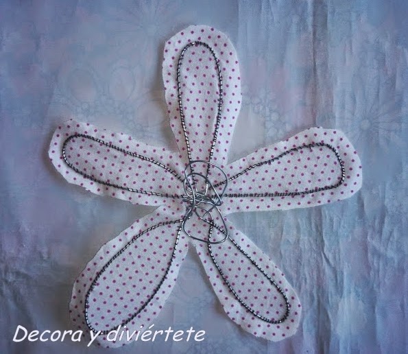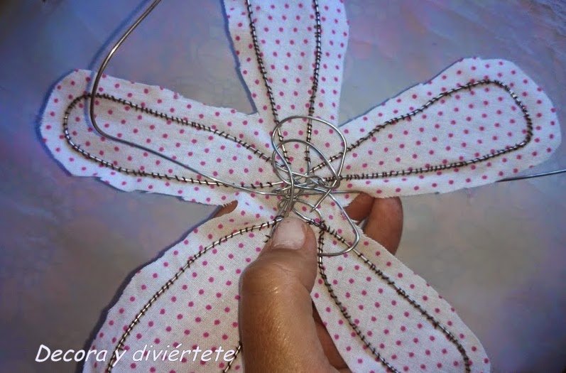 Una vez conseguida la forma de la flor ponéis la flor encima de la tela , por la parte bonita de esta , y empezáis a unir cosiendo el alambre a la tela , fijaos bien en la foto .... Un pequeño truco es estirar un poco de la tela a la hora de coser ...