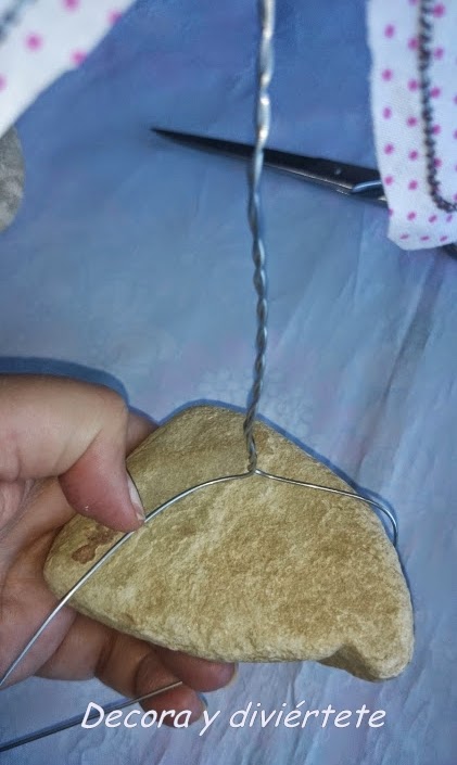 Ahora tenéis que cortar mas alambre para disimular el centro de la flor y hacer el tallo , cortar bastante alambre ya que con este se hará todo lo que falta hacer . Coger un extremo del alambre y pasarlo por el centro de la flor , y buscar la mitad del alambre ( NO cortéis el alambre ), después enrollar a partes iguales las dos mitades del alambre en el centro de la flor y con lo que sobre hacer el tallo enrollándolo entre si y el final lo unís a una piedra para que quede de pié .