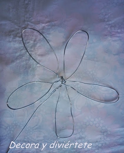 Primero tenéis que conseguir de hacer la forma de una flor de 5 pétalos con el alambre , si no quedan los pétalos perfectos no pasa nada .Si os sobra alambre como me paso con esta flor a mi , tenéis dos opciones cortarlo o dejarlo para después enrollarlo en el centro de la flor.